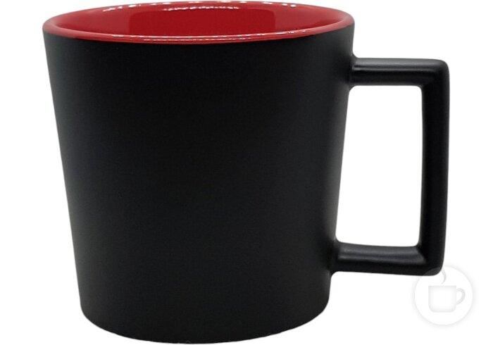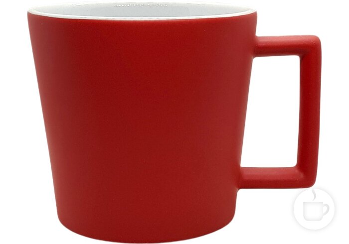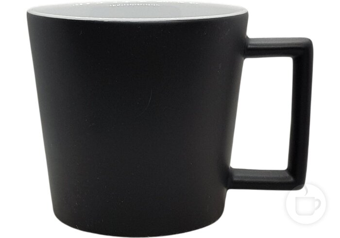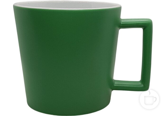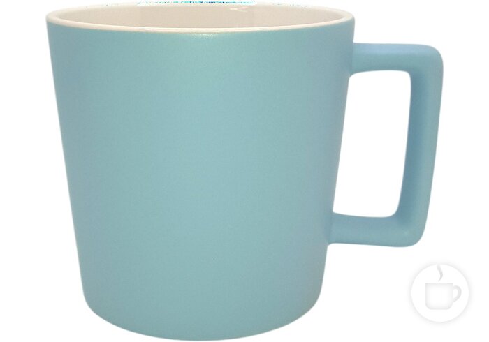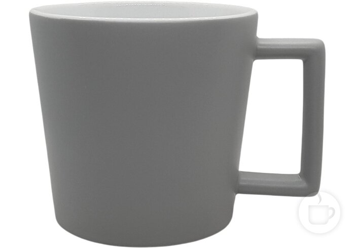 Keramikinis puodelis plačia stačiakampe ąsele ir matiniu paviršiumi